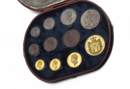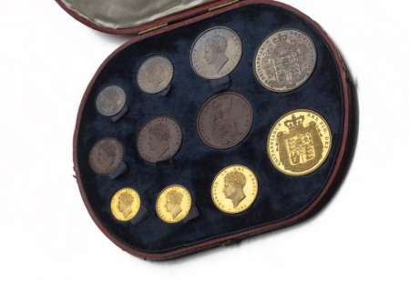 in contemporary red leather fitted case comprising coins from five pounds down to maundy penny