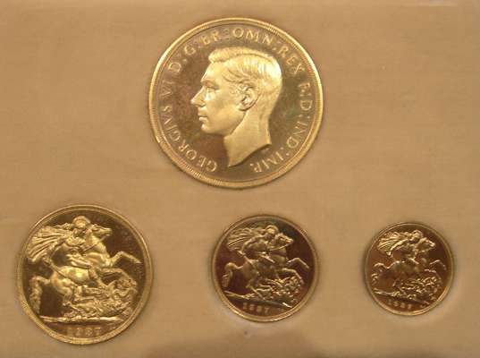in original leather fitted case comprising coins from five pounds down to sovereign
