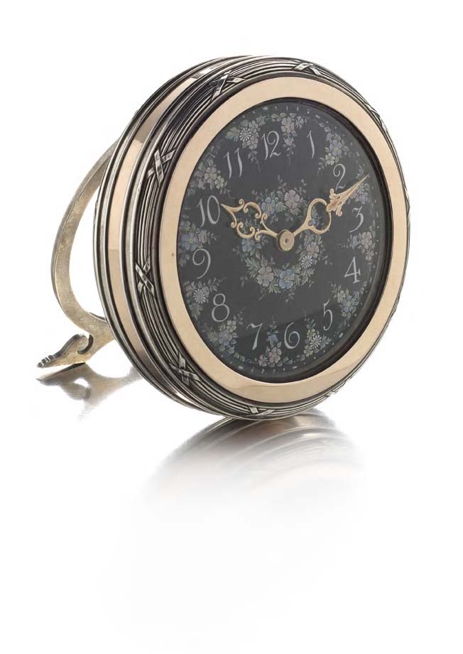 with marks for London 1901, maker Alfred Clark, of circular outline, the black enamelled dial with white Arabic numerals and polychrome enamel decorated floral borders, with ribbon-tied reeded bezel, also stamped CLARK, 20 OLD BOND STREET