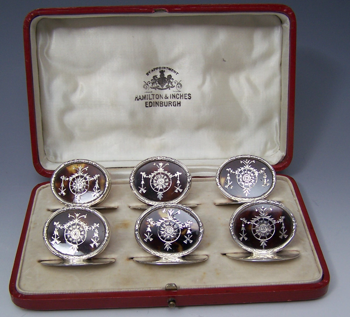 A cased set of tortoiseshell and pique decorated menu card holders,