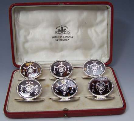 with marks for Birmingham 1913, maker William Comyns, the case marked Hamilton and Inches Edinburgh, each of upright oval form, with floral threaded border, raised on a shaped oval base