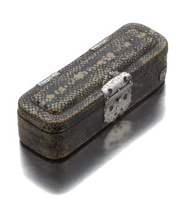 apparently unmarked, of rounded rectangular form, with foliate engraved escutcheon and hinges, the hinged cover opening to reveal an imprinted leather flap and shallow compartment, with additional pull-out drawer to one end, near the base