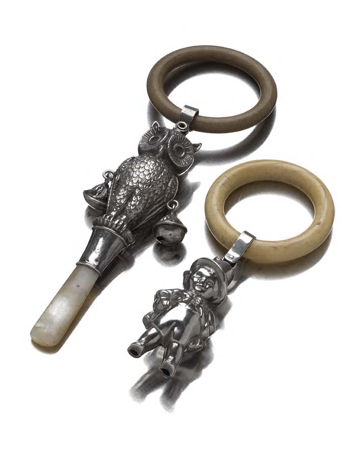 one modelled as an owl with bells, the other as a young boy with a top hat, both with marks for Birmingham circa 1900