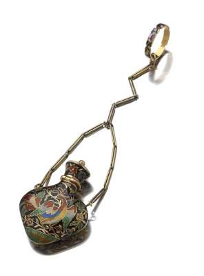 of shaped oval form, with hinged cover and inner stopper, suspended from a fancy link chain and suspension ring, decorated to one side with a figure holding a bird, the opposite side decorated with a ho-ho bird, within foliate decorated borders, to a black ground, contained in a fitted case