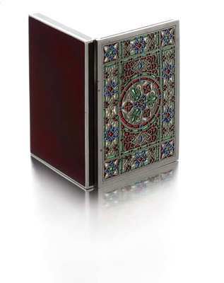 stamped STERLING, 935..., of rectangular outline, with floral plique a jour decorated hinged cover, the sides and base decorated with deep red guilloche enamel