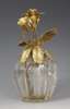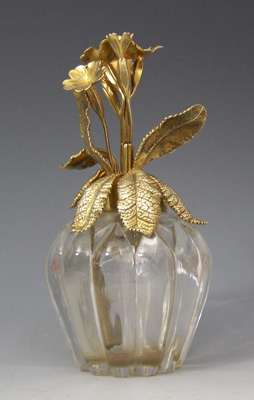 with marks for London 1886, maker E.H. Stockwell, the lobed ovoid glass body with gilt collar inscribed THORNHILL BOND ST W, surmounted by naturalistically cast and gilded primroses and foliage