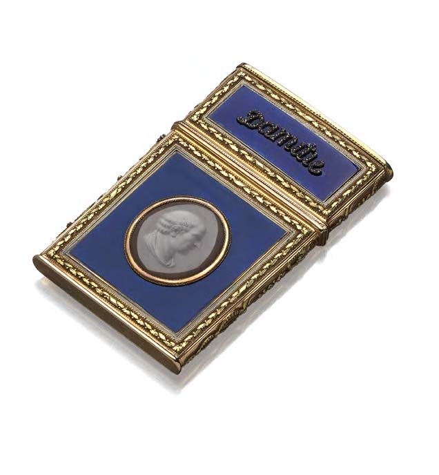 of slim, slightly tapered rectangular form, decorated to each side with an oval plaque depicting a male portrait profile en grisaille, within a deep blue guilloche enamelled panel and outer two-colour gold foliate and bead borders, the hinged cover applied with rose cut diamond set inscription SOUVENIR DAMITIE, to a similarly enamelled ground, with old mine cut diamond set push-button, opening to reveal a fitted interior containing an ivory aide memoire and a pencil