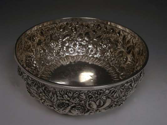 marked to the underside STERLING, the body chased and embossed with bold foliate and fruit design, with simple pedestal foot