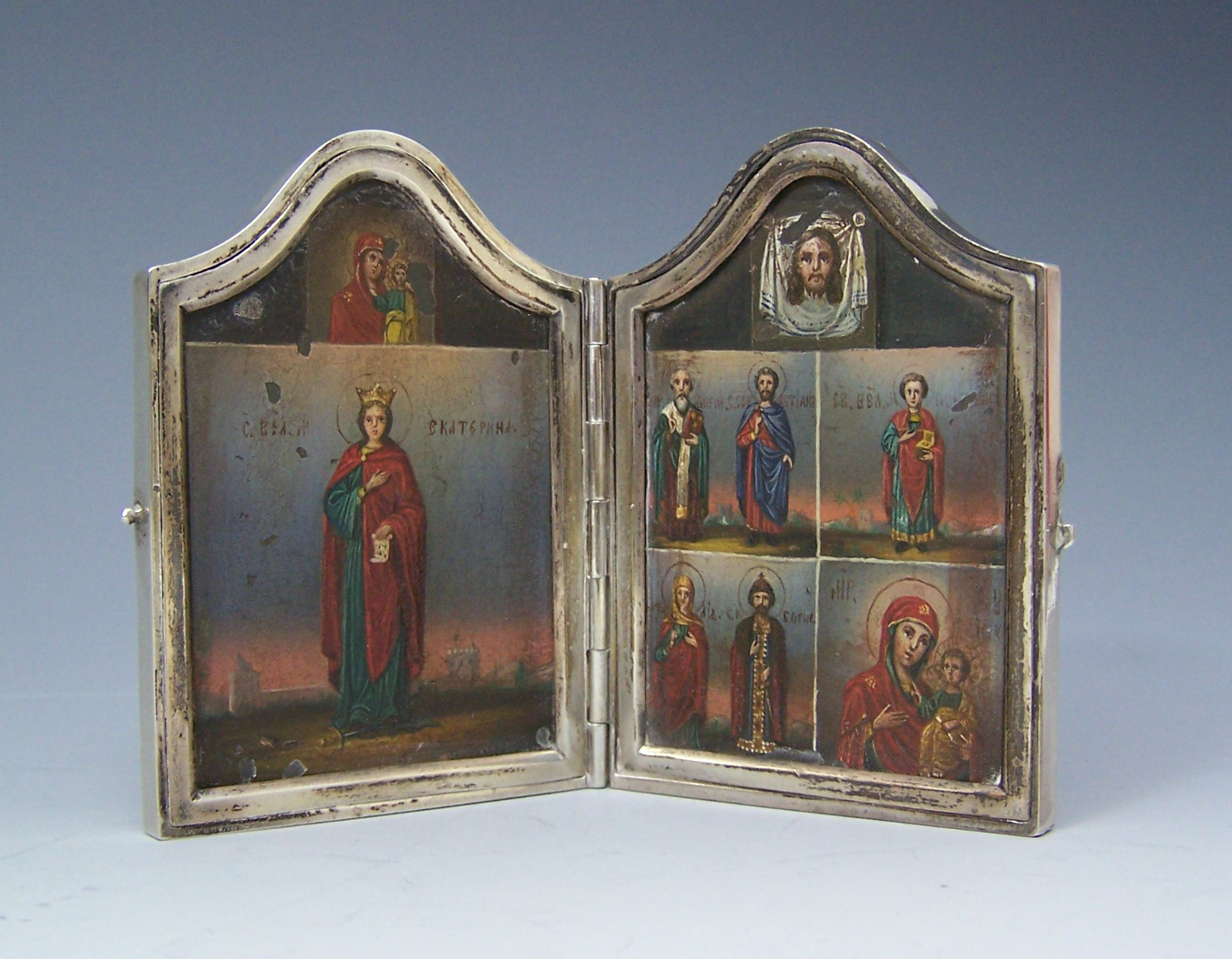 of hinged upright rectangular form with arched top, applied to the front with a cross, with hinged suspension ring to reverse, opening to reveal various hand-painted religious figures