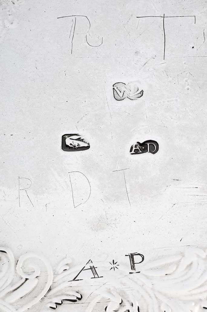 marked alligator's head, WD conjoined and A.D, of shaped circular form, raised on three hoof feet, with pie-crust moulded border, with foliate and scroll chased border around the central engraved crest of GRIFFITH of Llwynduris, Cardiganshire, with lightly engraved initials to reverse