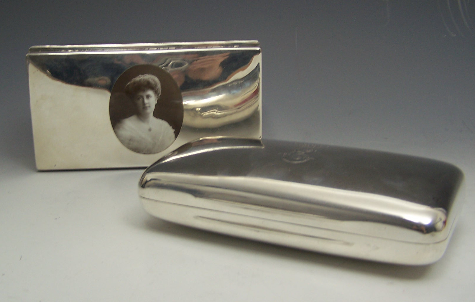 with marks for Birmingham 1908, maker's mark T.B., of plain rectangular form, inset to the centre of cover with an enamelled photograph; together with a cigar box, London 1888, maker's mark FP, of rounded rectangular outline, initialled "E" beneath a coronet (2)