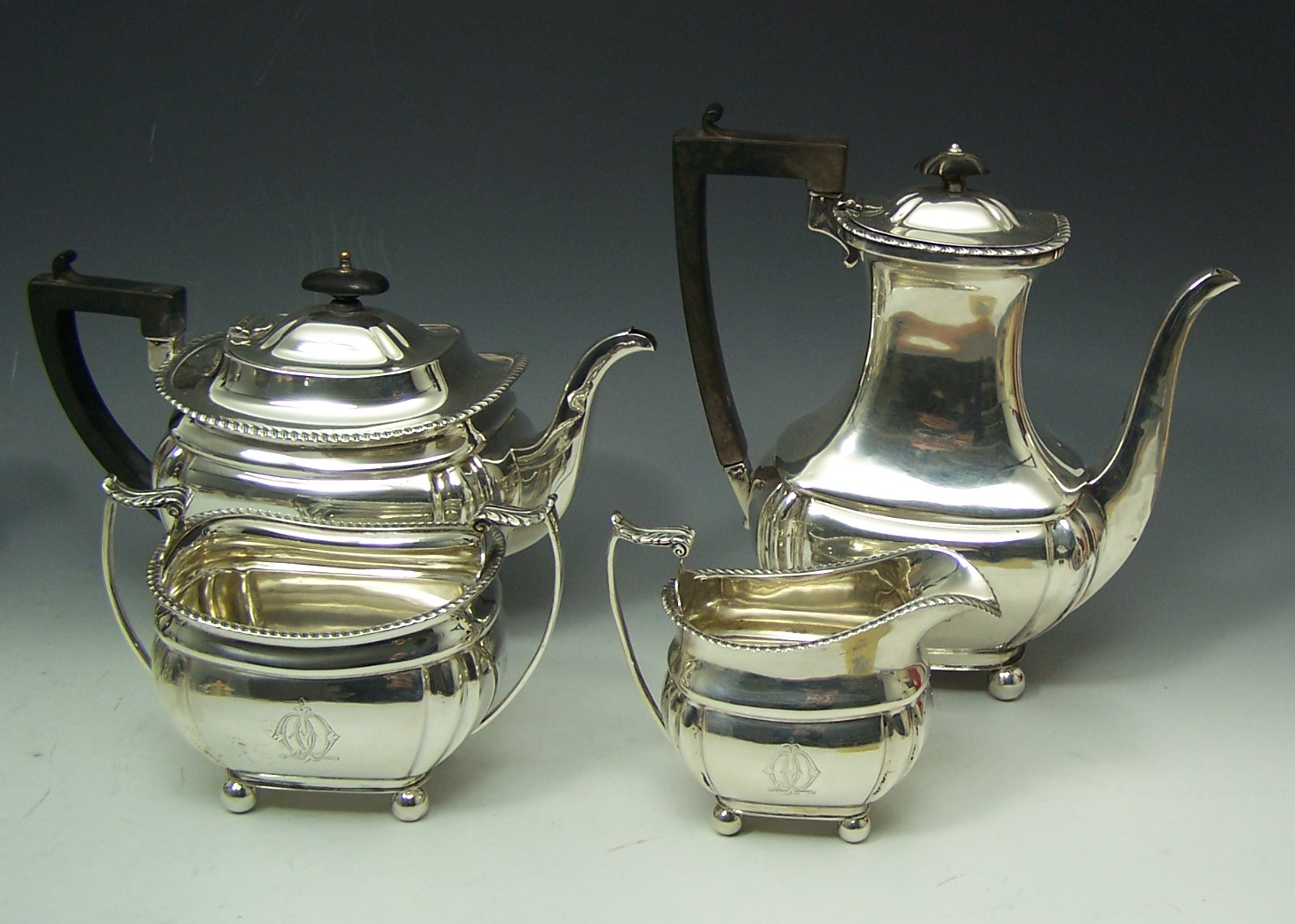 with marks for London 1906, 1907 & 1908, maker's mark HA&S, comprising teapot, coffee pot, twin-handled sugar bowl and milk jug, each of boat form, with gadrooned borders on four ball feet, monogrammed