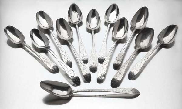 various dates and makers to include Dublin 1794, 1796, 1806 and others, three stamped STERLING CTIW, each of Old English pattern, bright engraved, with starbursts engraved terminals, crested, some also initialled