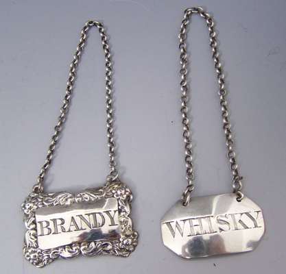 by Alexander Cameron, marked AC, thistle, thistle with cast foliate border and inscribed BRANDY; together with another Edinburgh example of octagonal form inscribed WHISKY (2)