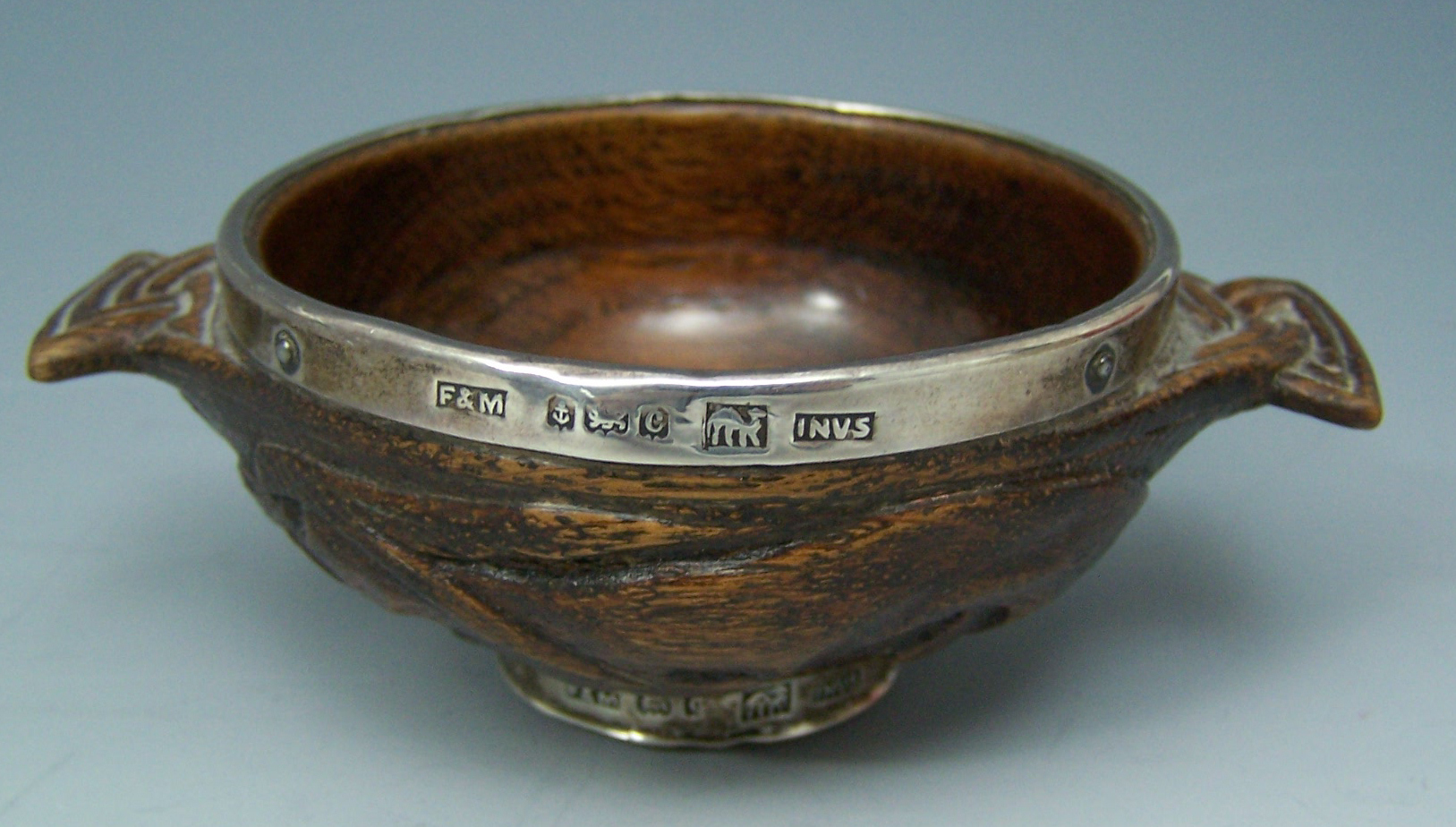 by Ferguson and MacBean, the turned and carved wooden body with two mythical/Celtic beast and knotwork decoration, with similarly carved lugs and applied rim, foot and central disk, all marked F&M, Birmingham 1903, camel, INVS, the central disk engraved SGUAB ASI, rim engraved with presentation inscription JAMES OF ALVIE 1ST LKA 1903