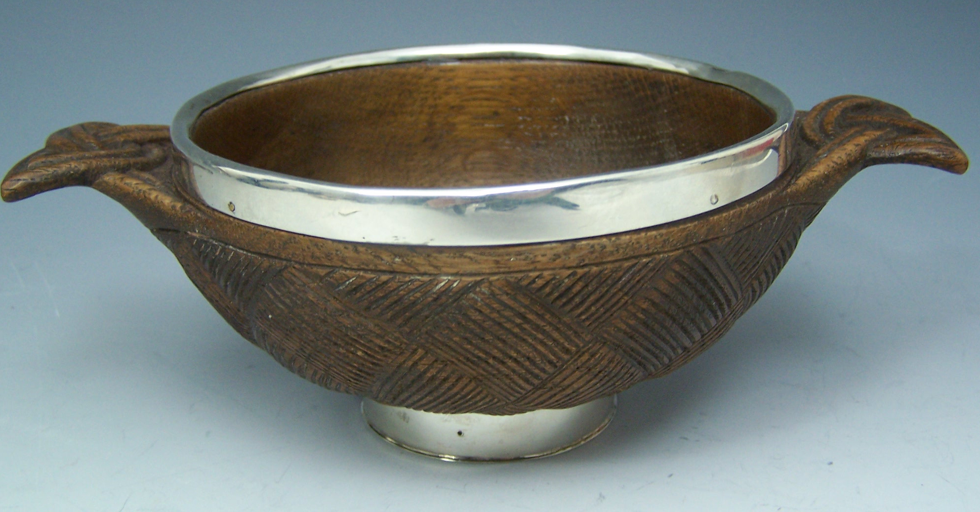 by Fraser Ferguson and MacBean, marked to rim F.F&M, camel, INVSS and to foot rim, F.F&M, INVSS, with basket weave carved wooden body and handles with Celtic knot decoration
