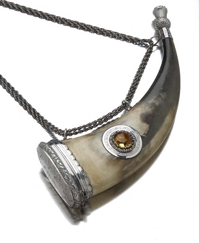 with marks for London 1836, maker MS, the cover of elongated oval form with well engraved thistle border, inscribed T. Willis, with chased lower thistle border and button release to an inner thistle border decorated lid, gilt interior, the flattened cow horn with applied circlet inset foil backed Cairngorm within chased mount, the body with heavy chain suspension, the tip with screw out thistle headed pricker, also with inset cairngorm