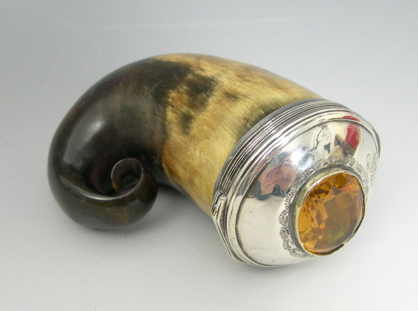 the mounts unmarked, the domed lid with inset oval foil-backed paste Cairngorm, with slight engraved border and initials, reeded border