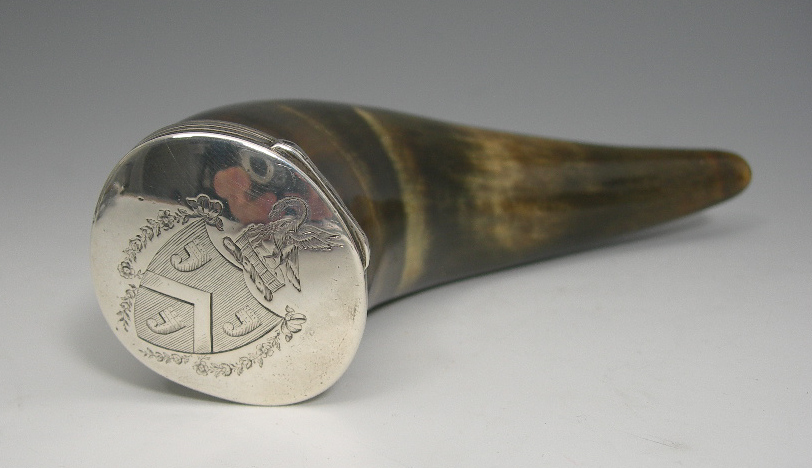 with marks circa 1825, for the York maker James Barber, George Cattle and William North, the horn plain, the mounts with reeded edge, the lid engraved with the arms of ARTHUR of Springfield of Essex