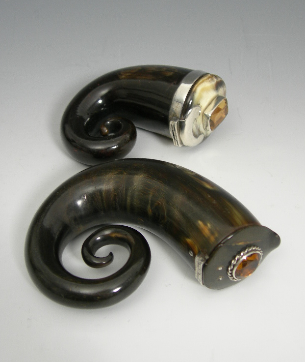 the lid with foil backed Cairngorm, simple hinge and plain mounts, unmarked; together with another similar horn snuff mull, the lid with inset circular cairngorm within ropetwist border, the lid with leather plug, the horn of good colour and twist (2)