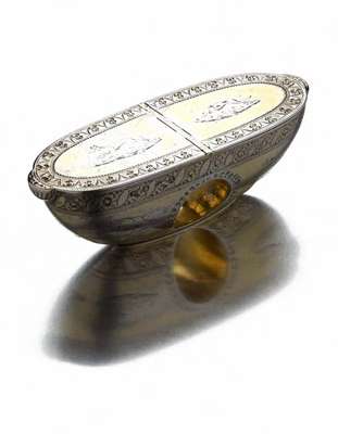 circa 1780, by Thomas Phipps and Edward Robinson II (struck with lion passant and maker's mark only), of oval outline and tapered form, with two flat hinged covers opening to reveal two compartments, with central finger grip, bright engraved throughout with prick-dot, wriggle-work and foliate borders, additionally engraved with hounds, hares, stags and foxes, crested and inscribed to base JULY 20TH 1789, THE GIFT OF MR RALPH BROWN WILDE BROWN TO MR ROBT. ROWD. BERKELEY