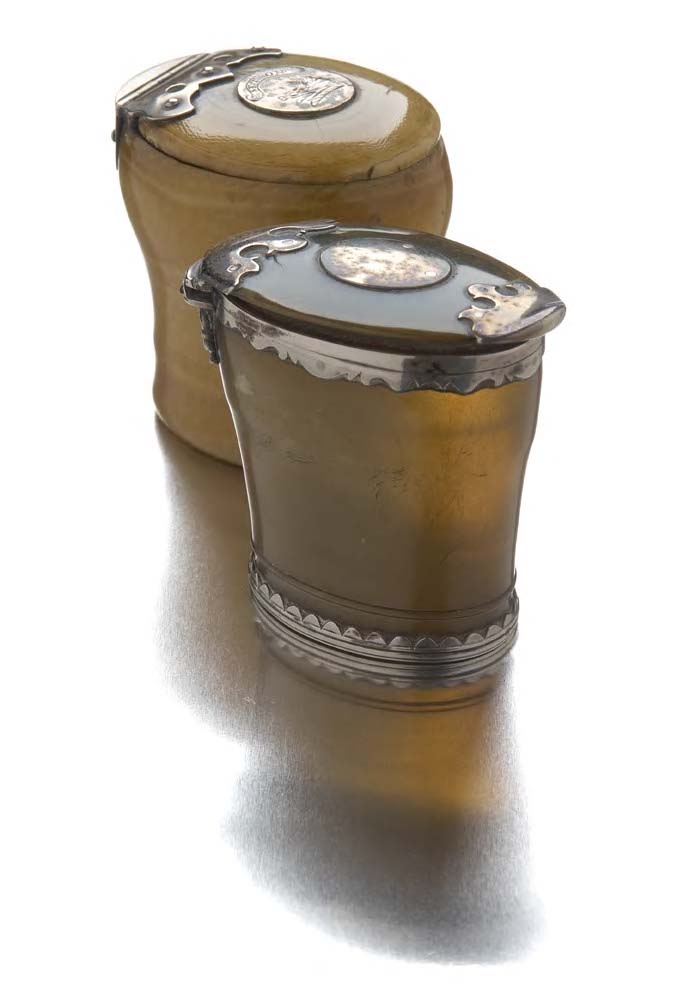 mounts apparently unmarked, of plain baluster form with hinged lid, the lid set with a central circular disk with clan crest of a boar's head facing right below the motto SET ON