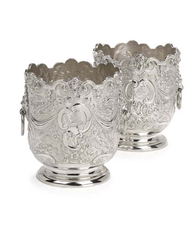 with marks for London 1896 and 1899, maker Charles Stuart Harris, each of cylindrical form on pedestal foot, with C-scroll and mask border, the body with well chased C-scroll and floral design, flanked by lion mask handles, engraved with a crest for PHILLIPS of Shropshire