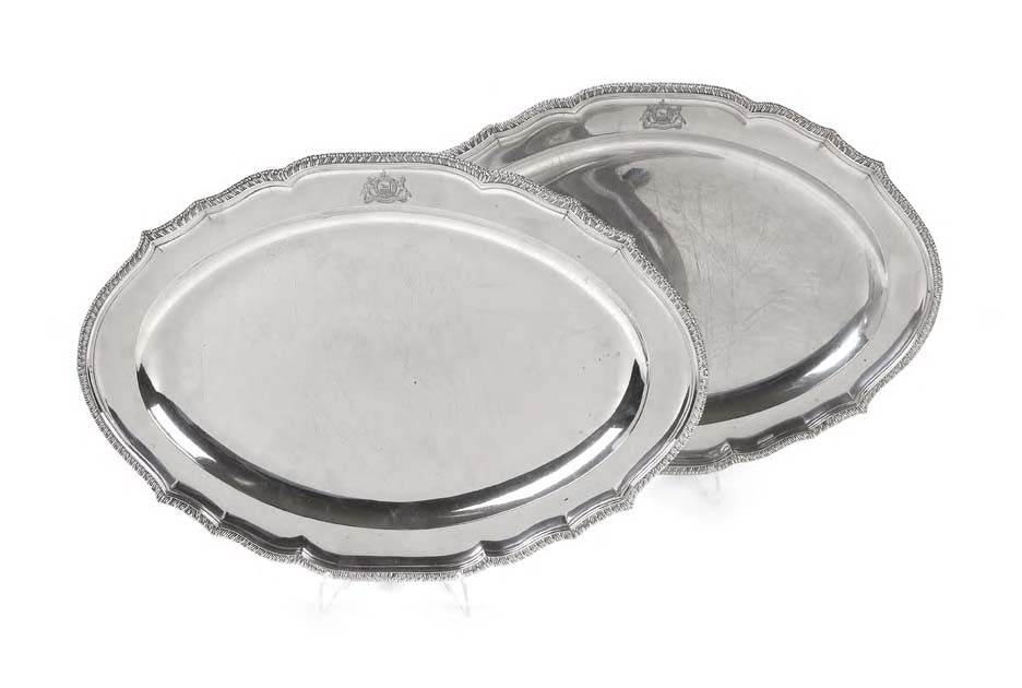with marks for London 1775, maker Andrew Fogelberg, of plain oval form with gadrooned border with engraved coat of arms, each numbered - No.4, with scratch weight 55 - 11; No.3, with scratch weight 55-10