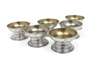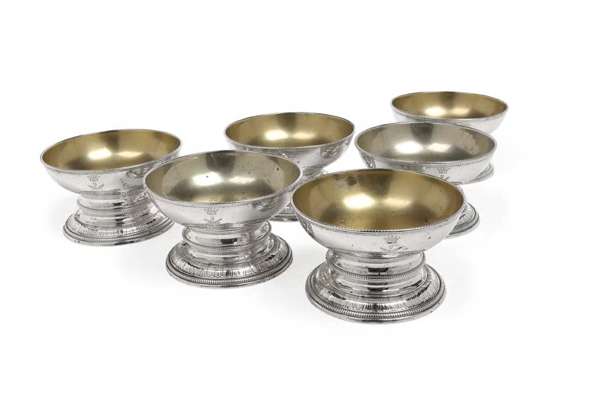 with marks for London 1756, maker David Hennell, each of plain collet or capstan form with spreading open circular bowl, threaded border, lightly engraved and crested, raised on a spool foot with engraved detail and slight beaded border, with gilt interiors, each numbered 1-6 and with scratch weights