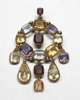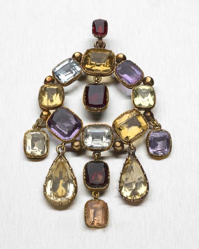 of fringed circular design, set with assorted cushion cut gems, to include citrine, amethyst, chrysoberyl, rock crystal, aquamarine, garnet and pink topaz, suspending various large pear and cushion cut drops