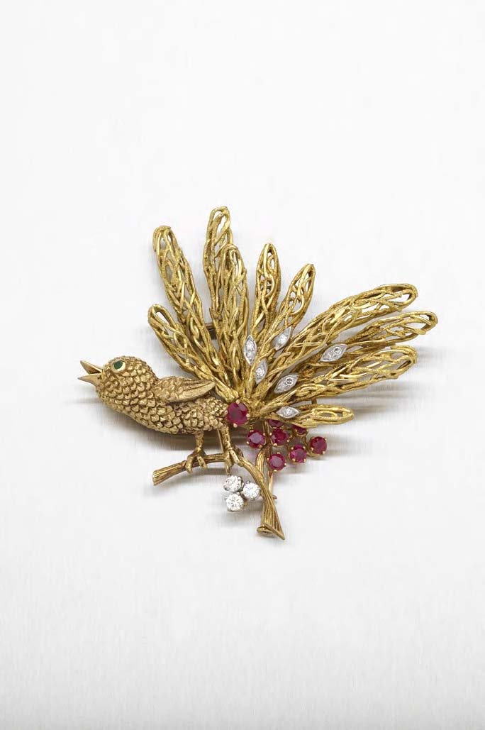 designed as a singing bird, with emerald set eye, perched on a flowering branch, set with graduated circular cut rubies, single and round brilliant cut diamonds, with fitted case stamped MASRIERA y CARRERAS ... BARCELONA