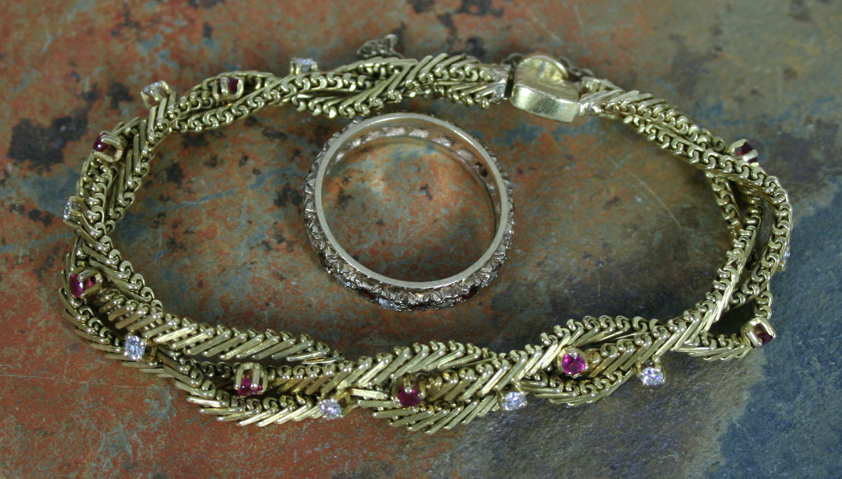 composed of plaited textured links, alternately set with circular cut rubies and round brilliant cut diamonds, with sliding clasp and safety chain; also a full-eternity ring, alternately set with circular cut garnets and colourless gems (2)