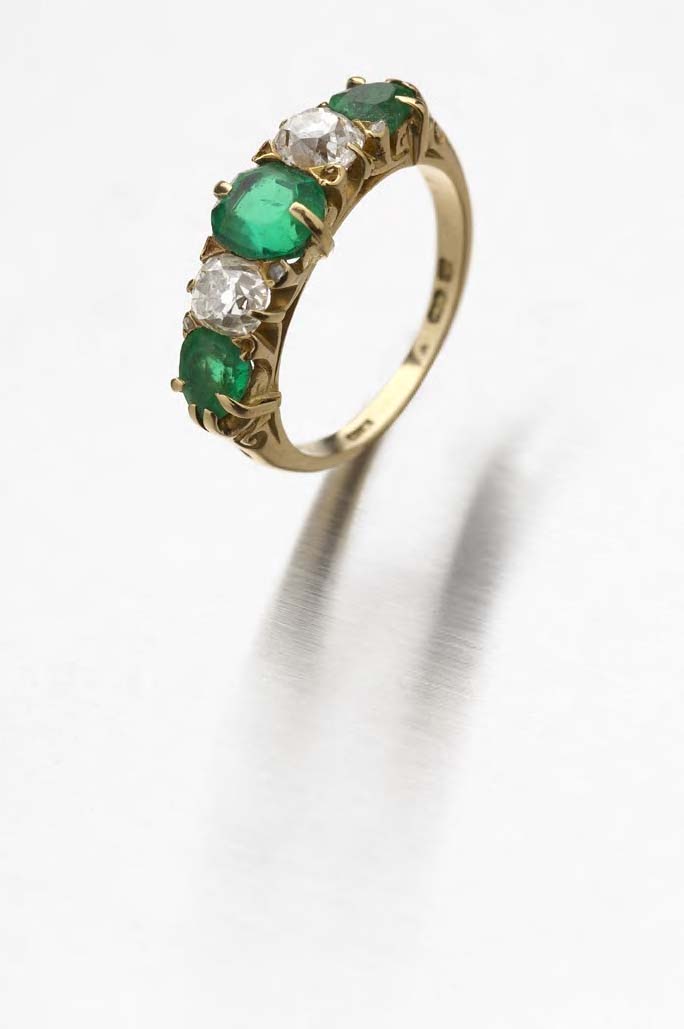 claw set with three graduated oval cut emeralds and two old European cut diamonds, with rose cut diamonds between