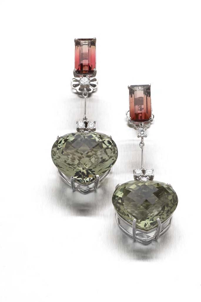each corner claw set with a trap cut watermelon tourmaline, surmounting a claw set round brilliant cut diamond, above a knife bar, suspending a cluster of three round brilliant cut diamonds, atop a large fancy heart cut green amethyst drop