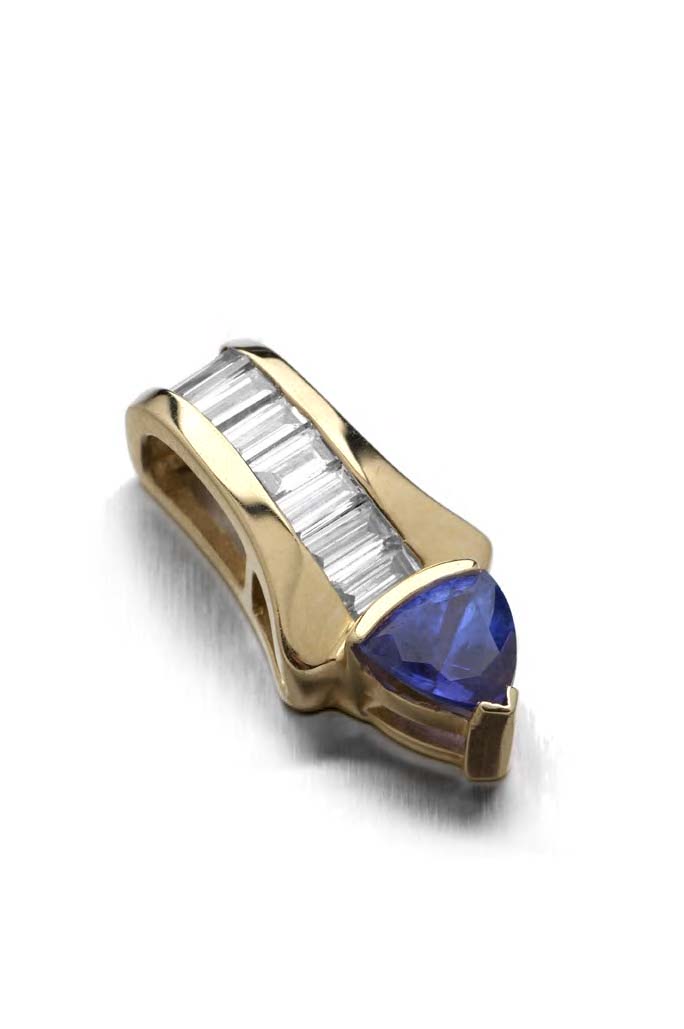 of tapered design, channel set with a border of baguette cut diamonds, suspending a claw set fancy triangular cut tanzanite drop