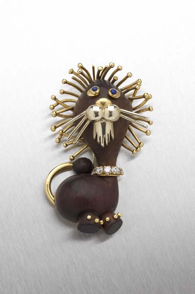 designed as a stylised lion, with carved wooden body, blue cabochon set eyes and round brilliant cut diamond set collar, signed, with French control marks, numbered 19686