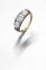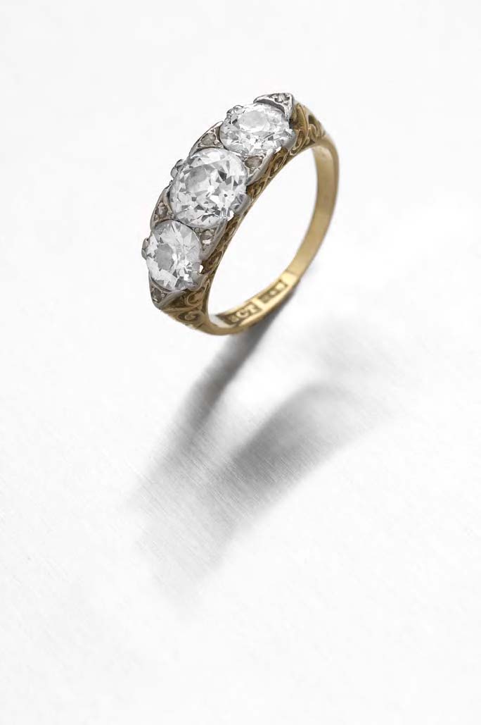 set with three slightly graduated old European cut diamonds, with rose cut diamonds between and scroll pierced gallery