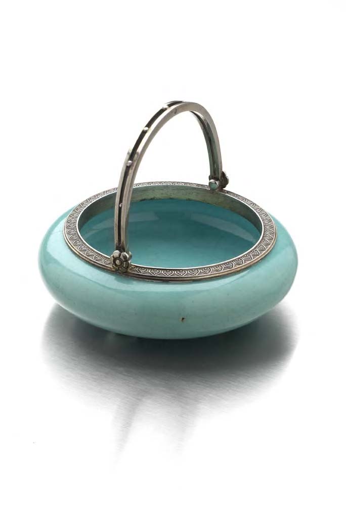 the squat circular pale turquoise glazed bowl, with three slightly projecting feet, the mounts by the Faberge workshop, work master KV, St Petersburg pre-1899, marked to frame and handle