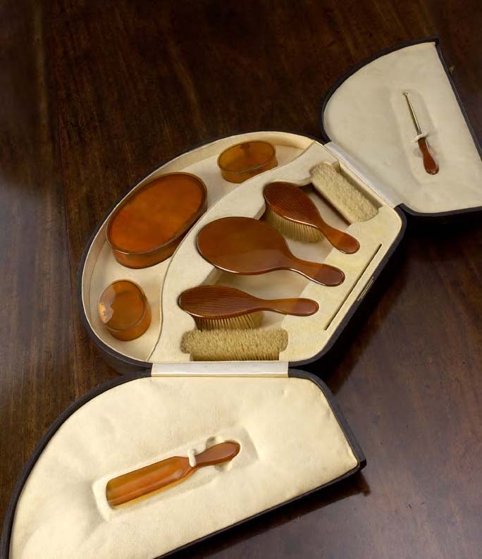 by Goldsmiths and Silversmiths Company Ltd, comprising a hand mirror, brushes, boxes, shoe horn, a cased manicure set and other pieces, contained in a fitted case; together with a matched manicure set, in a fitted tortoiseshell case (2)