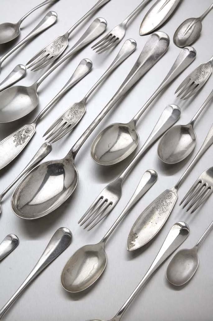 Sheffield 1904, by J Round, comprising a soup ladle, gravy spoons, fish knives and forks, table spoons, sauce ladles, dessert spoons and forks and other pieces, for twenty-four covers (some items lacking) contained in a fitted oak canteen; with additional fitted section, containing a matched three-piece tea service, Chester 1903 and 1904