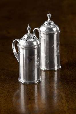 one probably by James Crichton, the other maker's mark unclear, Edinburgh 1888 and 1889, of cylindrical form with reeded rim and foot rim, the C-scroll handle similarly decorated, the domed pull-off covers pierced and with urn finials, the bodies with engraved crest of a dragon facing left inscribed GOD SEND GRACE (2)