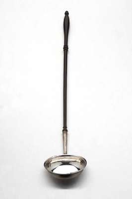 struck with maker's mark only to underside, of traditional form, with turned and knopped wooden handle to the plain oval shallow bowl