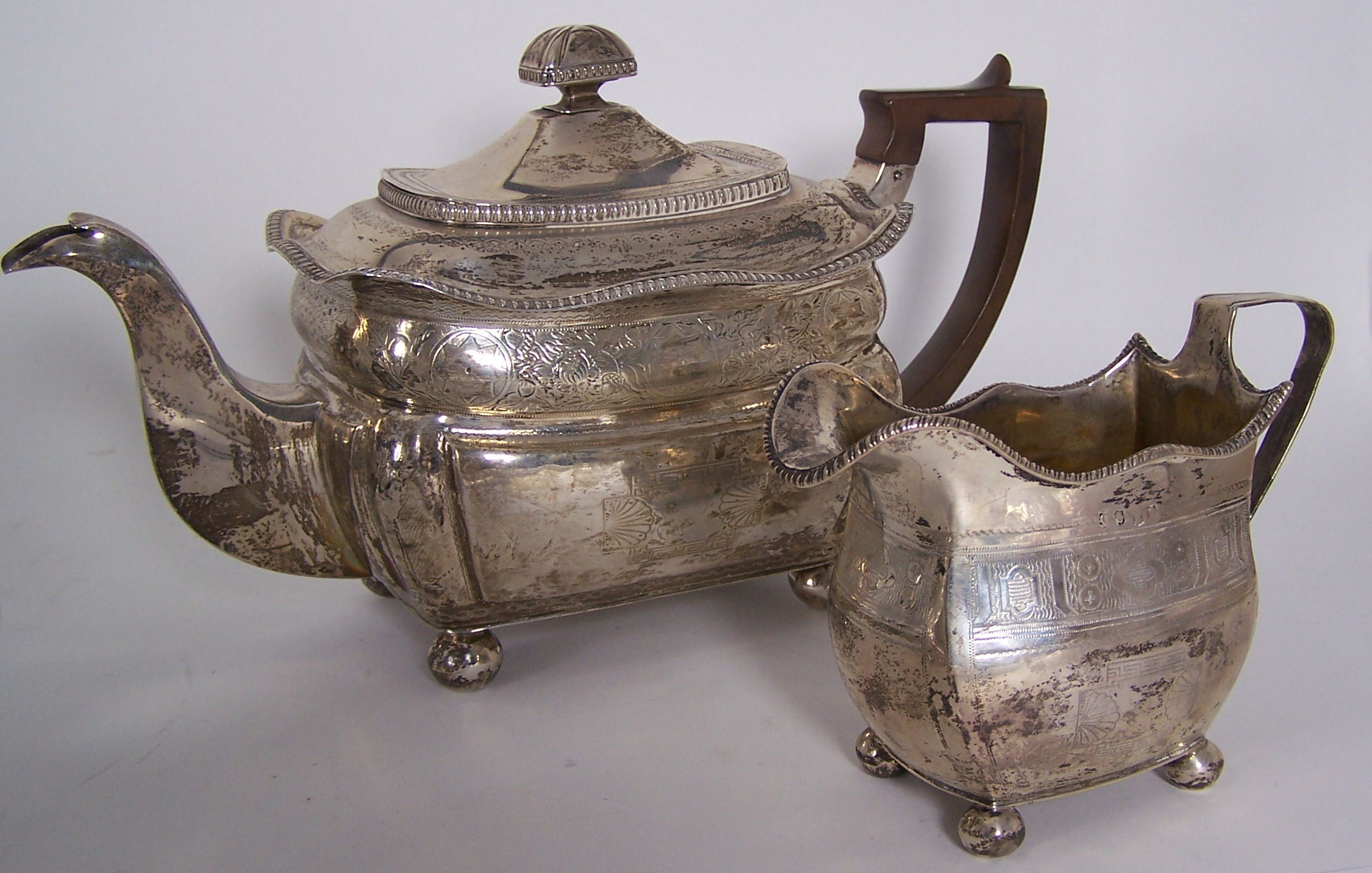 Dublin 1812, maker's mark TJC, marks to milk jug worn, of shaped rectangular outline, with beaded everted wavy rim, the bodies decorated with wriggle-work borders, cartouches and engraved floral and star borders, raised on ball feet