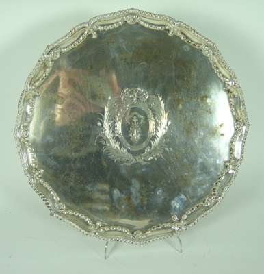 London 1774, maker's mark Richard Rugg, of shaped circular outline, with gadrooned and swag borders, the centre engraved with a foliate and bow cartouche, containing a crest, motto and initials