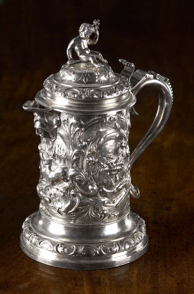 London 1848, maker Robert Hennel, of large size, decorated throughout with foliate scrolls and running hounds, with matching borders to the domed foot rim and hinged domed cover, with putti cast surmount and scroll thumb-piece to the beaded S-scroll handle with heart-shaped kick, with presentation inscription to one side AIRDRIE RACES MEMBERS CUP, PRESENTED BY JAMES BAIRD ESQ. MP. WON BY SWALEDALE 1851