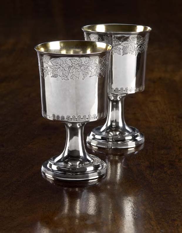 London 1810, by Robert Metham, each with slightly tapered bowl, with engraved fruiting vine border and gilt interior, on waisted tapering stem, to a simple reeded and stepped foot rim