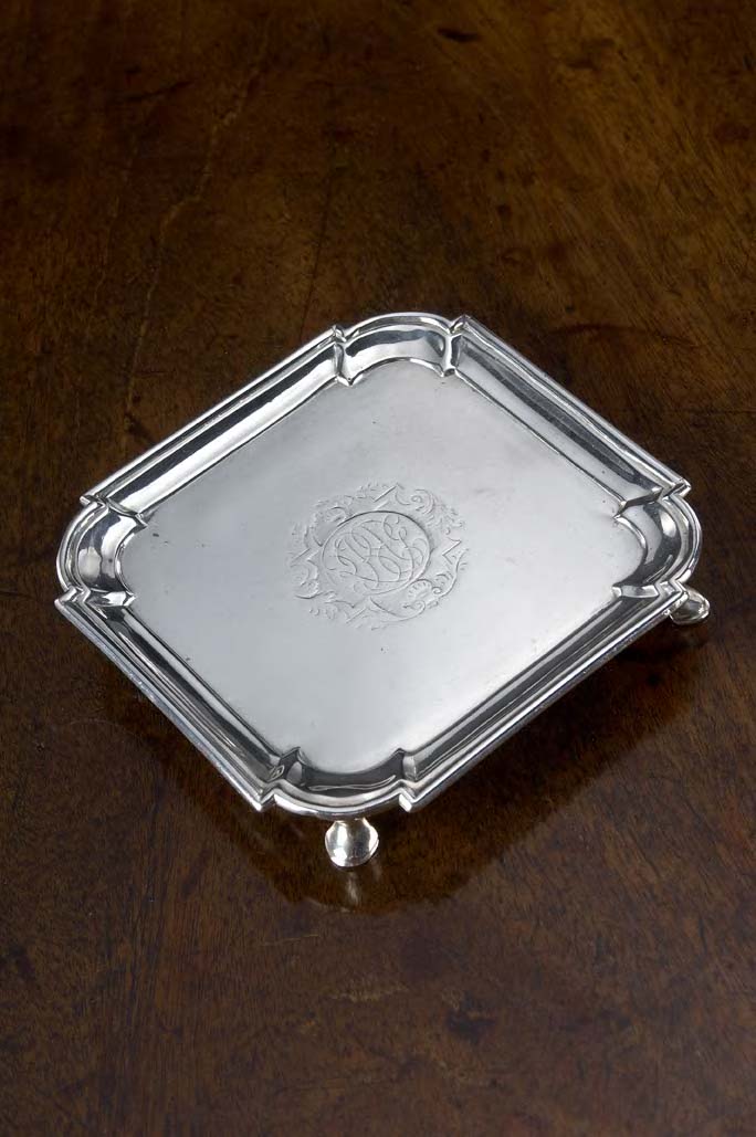 London 1725, by David Willaume, of shaped square form, raised on four hoof feet, engraved to the centre with conjoined initials within a cartouche