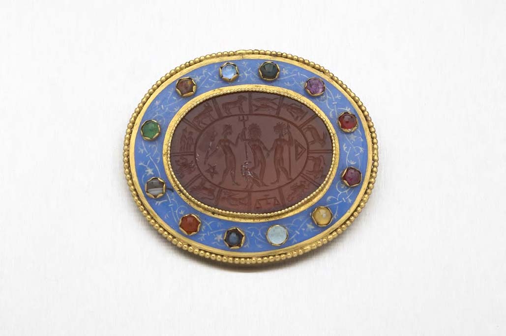 probably by Jules Wiese, stamped JW within a lozenge, with French control marks, the central oval agate intaglio, incised with figures and zodiac symbols, within bead borders set with circular cut assorted cabochons, to a pale blue enamelled border with white foliate scroll highlights