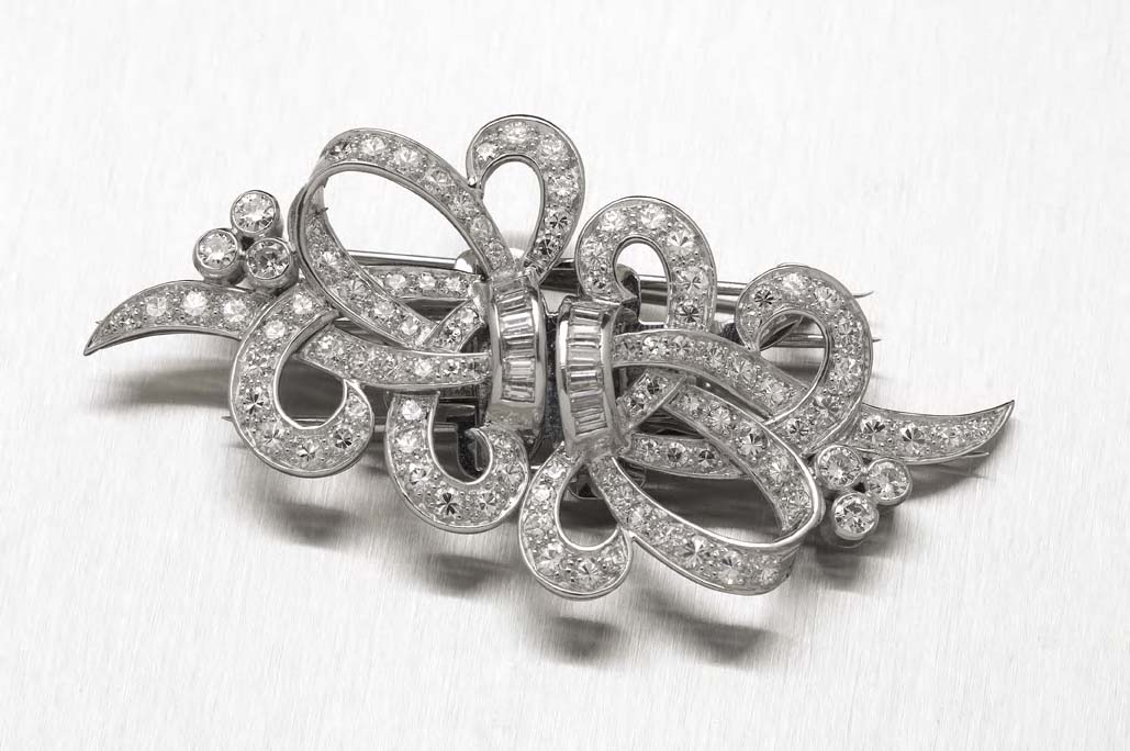 of ribbon scroll design, set throughout with clusters of graduated round brilliant and single cut diamonds and borders of channel set baguette cut diamonds, with detachable brooch conversion