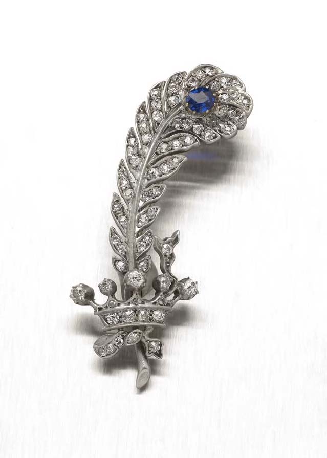 composed of an Earl's crown surmounted by an egret feather, set throughout with old European cut diamonds, with oval cut sapphire to the terminal, contained in a fitted case